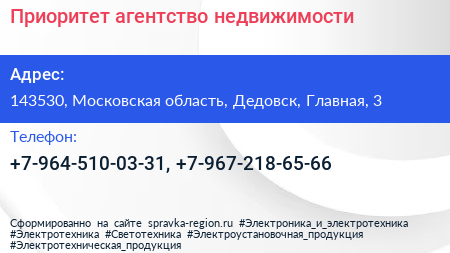 Приоритет, агентство недвижимости по адресу 143530, Московская область, Дедовск, Главная, 3 в дальнейшем Организация, размещена в следующих категориях: