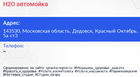 H2O, автомойка по адресу 143530, Московская область, Дедовск, Красный Октябрь, 5а ст3 в дальнейшем Организация, размещена в следующих категориях: