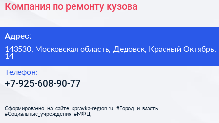 Компания по ремонту кузова по адресу 143530, Московская область, Дедовск, Красный Октябрь, 14 в дальнейшем Организация, размещена в следующих категориях:
