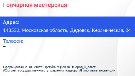 Гончарная мастерская по адресу 143532, Московская область, Дедовск, Керамическая, 24 в дальнейшем Организация, размещена в следующих категориях: