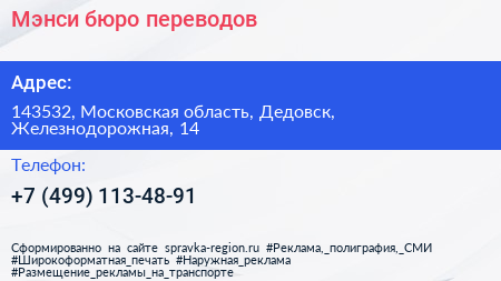 Мэнси, бюро переводов по адресу 143532, Московская область, Дедовск, Железнодорожная, 14 в дальнейшем Организация, размещена в следующих категориях: