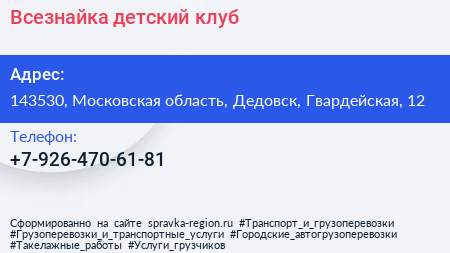 Всезнайка, детский клуб по адресу 143530, Московская область, Дедовск, Гвардейская, 12 в дальнейшем Организация, размещена в следующих категориях: