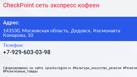CheckPoint, сеть экспресс-кофеен по адресу 143530, Московская область, Дедовск, Космонавта Комарова, 10 в дальнейшем Организация, размещена в следующих категориях: