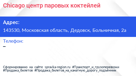Chicago, центр паровых коктейлей по адресу 143530, Московская область, Дедовск, Больничная, 2а в дальнейшем Организация, размещена в следующих категориях: