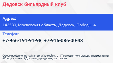 Дедовск, бильярдный клуб по адресу 143530, Московская область, Дедовск, Победы, 4 в дальнейшем Организация, размещена в следующих категориях: