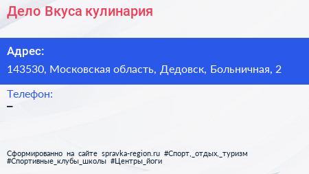 Дело Вкуса, кулинария по адресу 143530, Московская область, Дедовск, Больничная, 2 в дальнейшем Организация, размещена в следующих категориях: