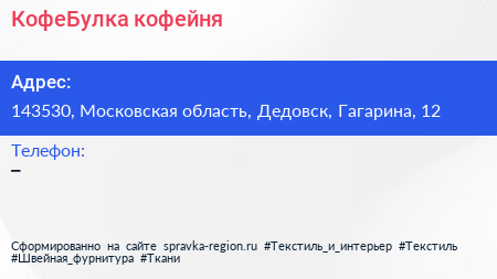 #КофеБулка, кофейня по адресу 143530, Московская область, Дедовск, Гагарина, 12 в дальнейшем Организация, размещена в следующих категориях: