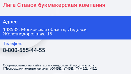 Лига Ставок, букмекерская компания по адресу 143532, Московская область, Дедовск, Железнодорожная, 15 в дальнейшем Организация, размещена в следующих категориях:
