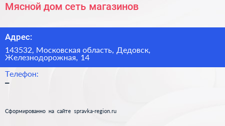 Мясной дом, сеть магазинов по адресу 143532, Московская область, Дедовск, Железнодорожная, 14 в дальнейшем Организация, размещена в следующих категориях: