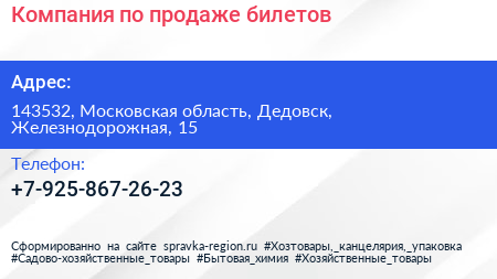 Компания по продаже билетов по адресу 143532, Московская область, Дедовск, Железнодорожная, 15 в дальнейшем Организация, размещена в следующих категориях: