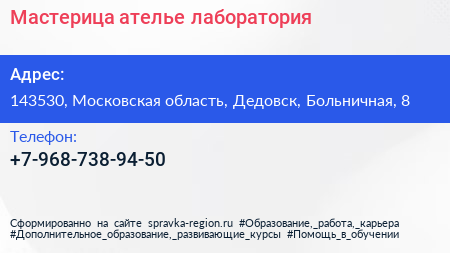 Мастерица, ателье-лаборатория по адресу 143530, Московская область, Дедовск, Больничная, 8 в дальнейшем Организация, размещена в следующих категориях: