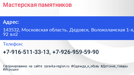 Мастерская памятников по адресу 143532, Московская область, Дедовск, Волоколамская 1-я, 92 вл2 в дальнейшем Организация, размещена в следующих категориях: