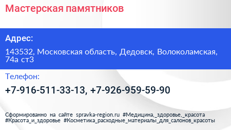 Мастерская памятников по адресу 143532, Московская область, Дедовск, Волоколамская, 74а ст3 в дальнейшем Организация, размещена в следующих категориях: