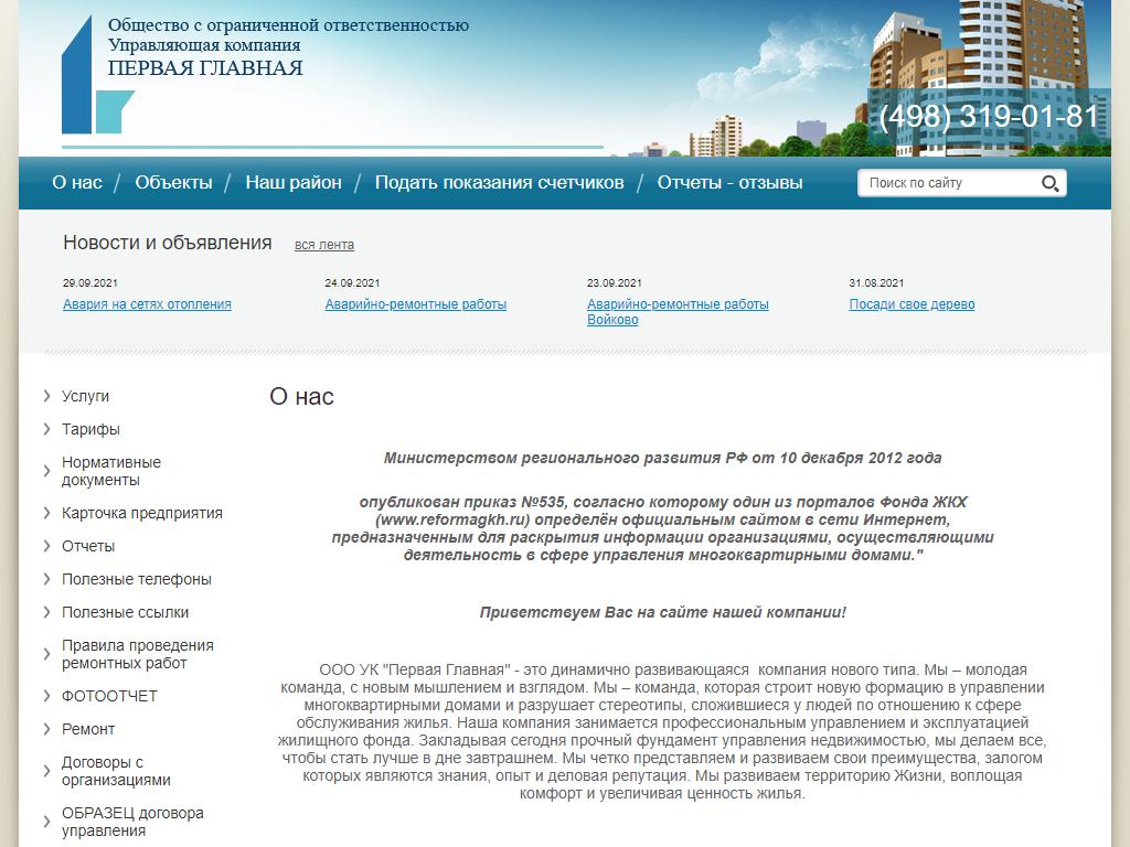 Первая главная, управляющая компания по адресу 143530, Московская область, Дедовск, Главная 1-я, 1 в дальнейшем Организация, размещена в следующих категориях: