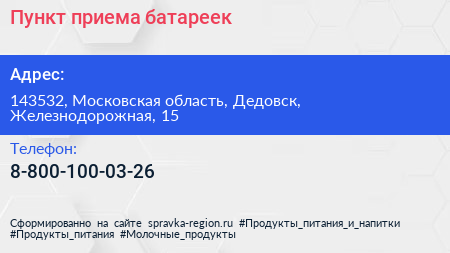 Пункт приема батареек по адресу 143532, Московская область, Дедовск, Железнодорожная, 15 в дальнейшем Организация, размещена в следующих категориях: