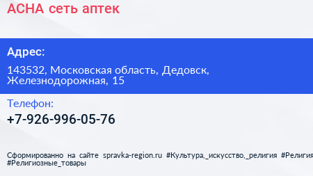 АСНА, сеть аптек по адресу 143532, Московская область, Дедовск, Железнодорожная, 15 в дальнейшем Организация, размещена в следующих категориях: