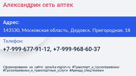 Александрин, сеть аптек по адресу 143530, Московская область, Дедовск, Пригородная, 18 в дальнейшем Организация, размещена в следующих категориях:
