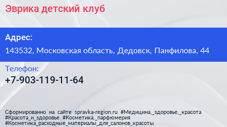 Эврика, детский клуб по адресу 143532, Московская область, Дедовск, Панфилова, 44 в дальнейшем Организация, размещена в следующих категориях: