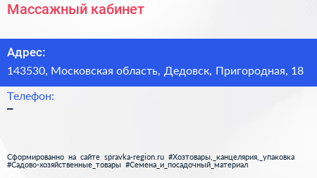 Массажный кабинет по адресу 143530, Московская область, Дедовск, Пригородная, 18 в дальнейшем Организация, размещена в следующих категориях: