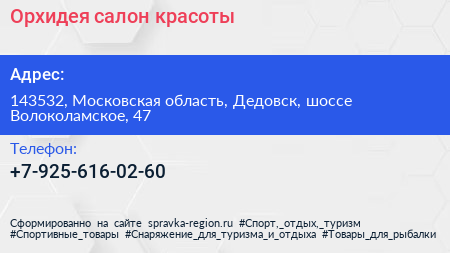 Орхидея, салон красоты по адресу 143532, Московская область, Дедовск, шоссе Волоколамское, 47 в дальнейшем Организация, размещена в следующих категориях: