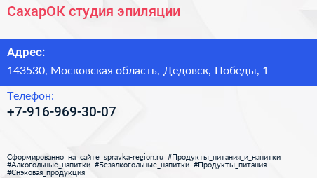 СахарОК, студия эпиляции по адресу 143530, Московская область, Дедовск, Победы, 1 в дальнейшем Организация, размещена в следующих категориях: