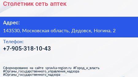 Столетник, сеть аптек по адресу 143530, Московская область, Дедовск, Ногина, 2 в дальнейшем Организация, размещена в следующих категориях: