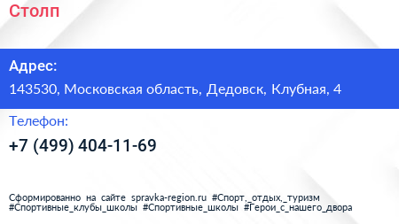 Столп по адресу 143530, Московская область, Дедовск, Клубная, 4 в дальнейшем Организация, размещена в следующих категориях: