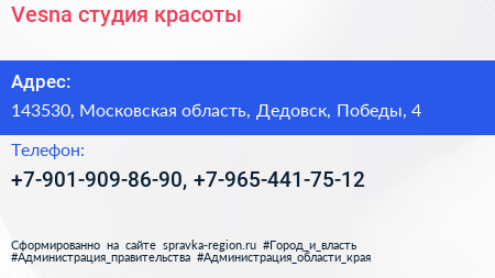 Vesna, студия красоты по адресу 143530, Московская область, Дедовск, Победы, 4 в дальнейшем Организация, размещена в следующих категориях: