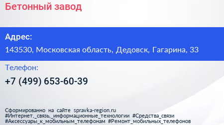 Бетонный завод по адресу 143530, Московская область, Дедовск, Гагарина, 33 в дальнейшем Организация, размещена в следующих категориях: