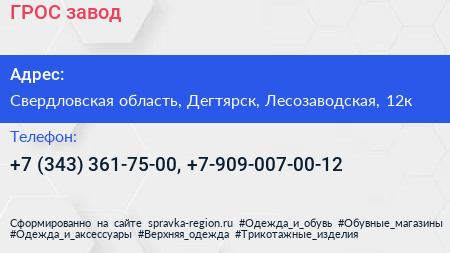 ГРОС, завод по адресу Свердловская область, Дегтярск, Лесозаводская, 12к в дальнейшем Организация, размещена в следующих категориях: