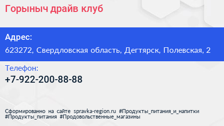 Горыныч, драйв-клуб по адресу 623272, Свердловская область, Дегтярск, Полевская, 2 в дальнейшем Организация, размещена в следующих категориях: