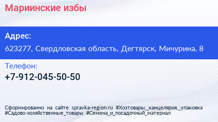 Мариинские избы по адресу 623277, Свердловская область, Дегтярск, Мичурина, 8 в дальнейшем Организация, размещена в следующих категориях: