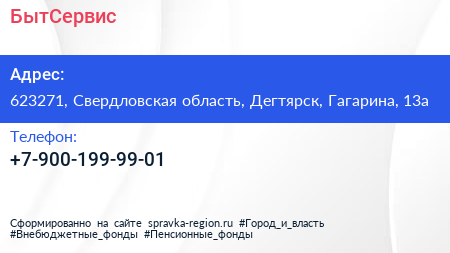БытСервис по адресу 623271, Свердловская область, Дегтярск, Гагарина, 13а в дальнейшем Организация, размещена в следующих категориях: