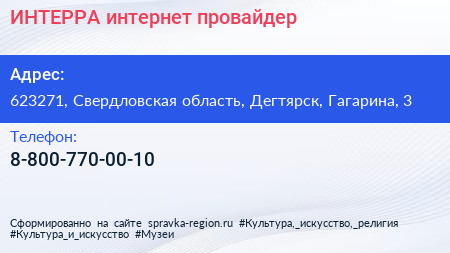 ИНТЕРРА, интернет-провайдер по адресу 623271, Свердловская область, Дегтярск, Гагарина, 3 в дальнейшем Организация, размещена в следующих категориях: