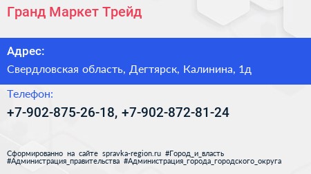 Гранд Маркет Трейд по адресу Свердловская область, Дегтярск, Калинина, 1д в дальнейшем Организация, размещена в следующих категориях:
