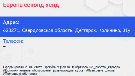 Европа, секонд-хенд по адресу 623271, Свердловская область, Дегтярск, Калинина, 31у в дальнейшем Организация, размещена в следующих категориях: