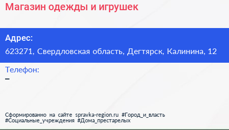 Магазин одежды и игрушек по адресу 623271, Свердловская область, Дегтярск, Калинина, 12 в дальнейшем Организация, размещена в следующих категориях: