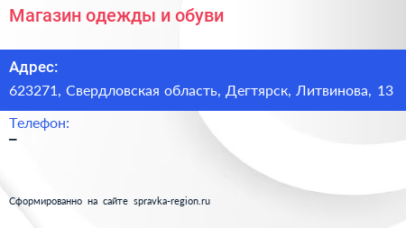 Магазин одежды и обуви по адресу 623271, Свердловская область, Дегтярск, Литвинова, 13 в дальнейшем Организация, размещена в следующих категориях: