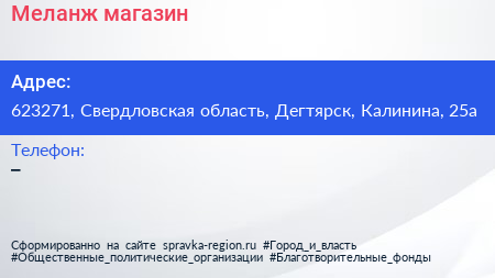 Меланж, магазин по адресу 623271, Свердловская область, Дегтярск, Калинина, 25а в дальнейшем Организация, размещена в следующих категориях: