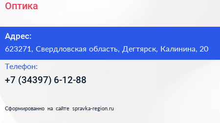 Оптика по адресу 623271, Свердловская область, Дегтярск, Калинина, 20 в дальнейшем Организация, размещена в следующих категориях: