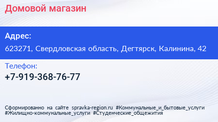 Домовой, магазин по адресу 623271, Свердловская область, Дегтярск, Калинина, 42 в дальнейшем Организация, размещена в следующих категориях: