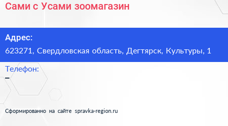 Сами с Усами, зоомагазин по адресу 623271, Свердловская область, Дегтярск, Культуры, 1 в дальнейшем Организация, размещена в следующих категориях: