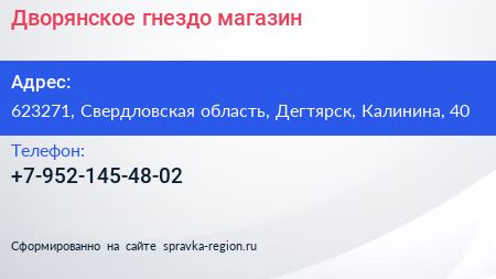 Дворянское гнездо, магазин по адресу 623271, Свердловская область, Дегтярск, Калинина, 40 в дальнейшем Организация, размещена в следующих категориях: