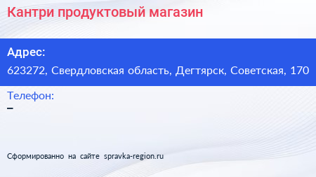 Кантри, продуктовый магазин по адресу 623272, Свердловская область, Дегтярск, Советская, 170 в дальнейшем Организация, размещена в следующих категориях: