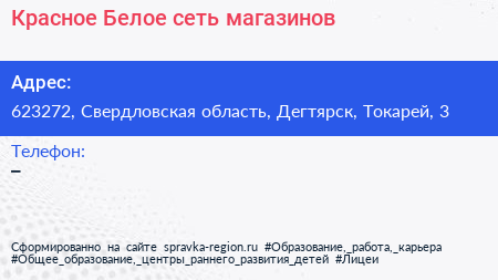 Красное & Белое, сеть магазинов по адресу 623272, Свердловская область, Дегтярск, Токарей, 3 в дальнейшем Организация, размещена в следующих категориях: