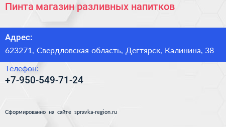 Пинта, магазин разливных напитков по адресу 623271, Свердловская область, Дегтярск, Калинина, 38 в дальнейшем Организация, размещена в следующих категориях: