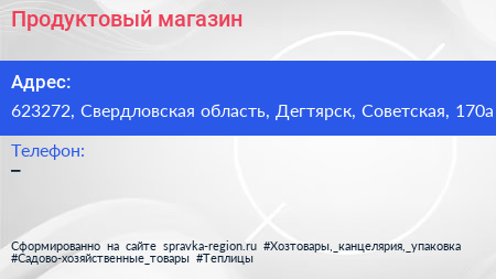 Продуктовый магазин по адресу 623272, Свердловская область, Дегтярск, Советская, 170а в дальнейшем Организация, размещена в следующих категориях: