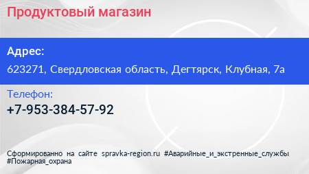 Продуктовый магазин по адресу 623271, Свердловская область, Дегтярск, Клубная, 7а в дальнейшем Организация, размещена в следующих категориях:
