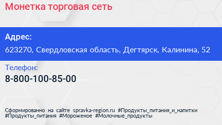 Монетка, торговая сеть по адресу 623270, Свердловская область, Дегтярск, Калинина, 52 в дальнейшем Организация, размещена в следующих категориях: