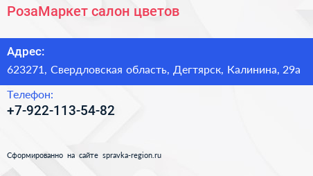 РозаМаркет, салон цветов по адресу 623271, Свердловская область, Дегтярск, Калинина, 29а в дальнейшем Организация, размещена в следующих категориях: